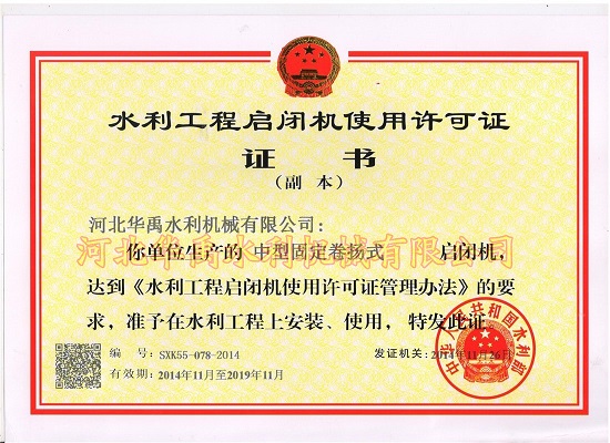 产品名称: 卷扬启闭机使用许可证 |